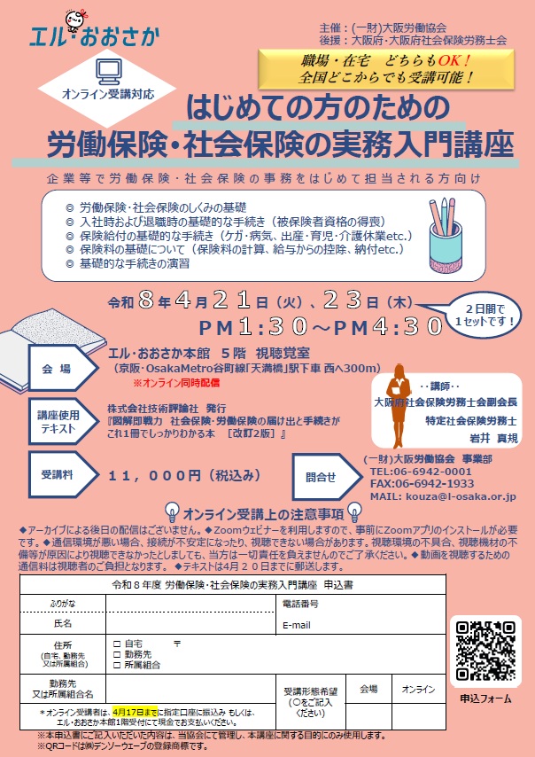 その他 | 2026.03.09 【(一財)大阪労働協会からのお知らせ】労働保険・社会保険の実務入門講座について 標記について大阪労働協会よりご案内がありました。詳細は、👇のURLをご確認ください。講座紹介ページhttps://www.l-osaka.or.jp/ork/pages/pageB.html